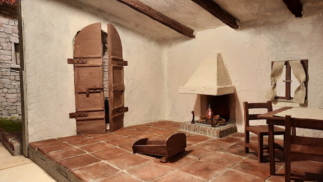 Troviamo, dunque: la culla del Bambino, i vasi da fiori, gli infissi, gli scuri, gli alari del camino, i fregi esterni della porta e l'insieme di catenaccio e cardini, le sedie (composte di due elementi innestati l'uno nell'altro), i supporti delle lampade (fiamma del camino e illuminazione della stanza), delle strisce a led per l'alternanza di giorno e notte e dei due proiettori che simulano il quarto di Luna e la Stella Cometa. Infine, vi è una staffa di collegamento fra l'arcata posteriore e il muro sinistro, per aumentare la robustezza dell'insieme e ridurre il rischio di danni da trasporto.